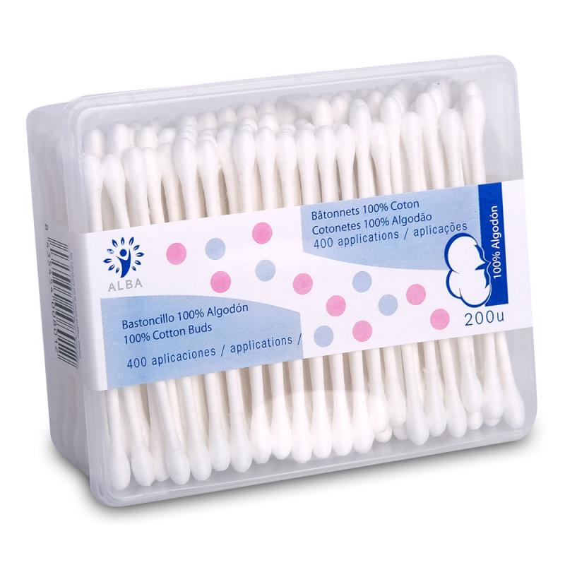 Bastoncillos auditivos de palo blanco en un paquete de 200 unidades.