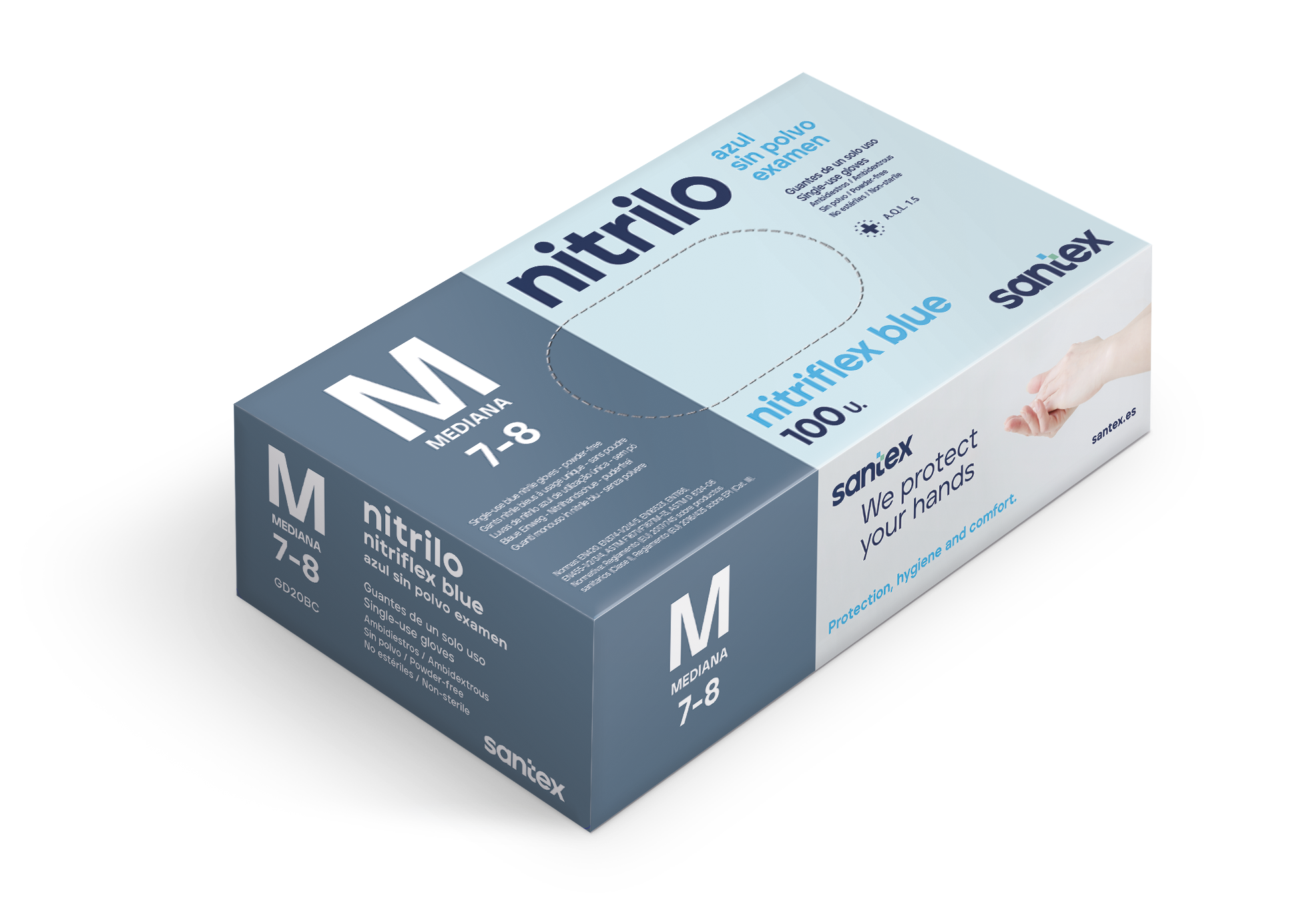 ESTUCHE 100 GUANTES NITRILO DESECHABLE AZUL SIN POLVO SANTEX REFERENCIA GD20 “NITRIFLEX BLUE” – GRAMAJE 3,5 GRAMOS.